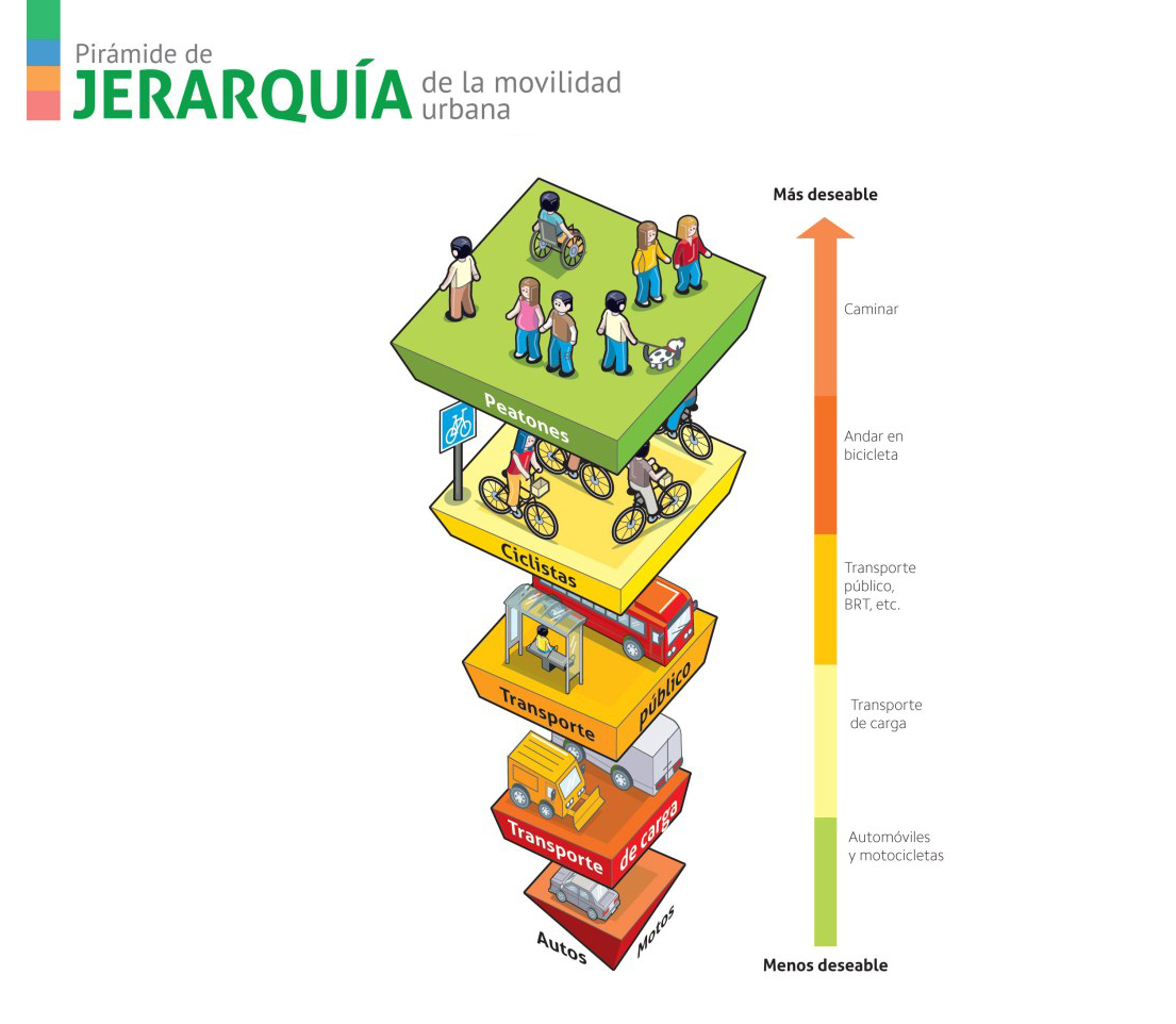 el peatón ocupa la cima de la Pirámide de la Movilidad. Le siguen, en orden descendente: 2) ciclistas; 3) usuarios del servicio de transporte público de pasajeros; 4) prestadores del servicio de transporte de carga y distribución de mercancías; y 5) usuarios de transporte particular automotriz.